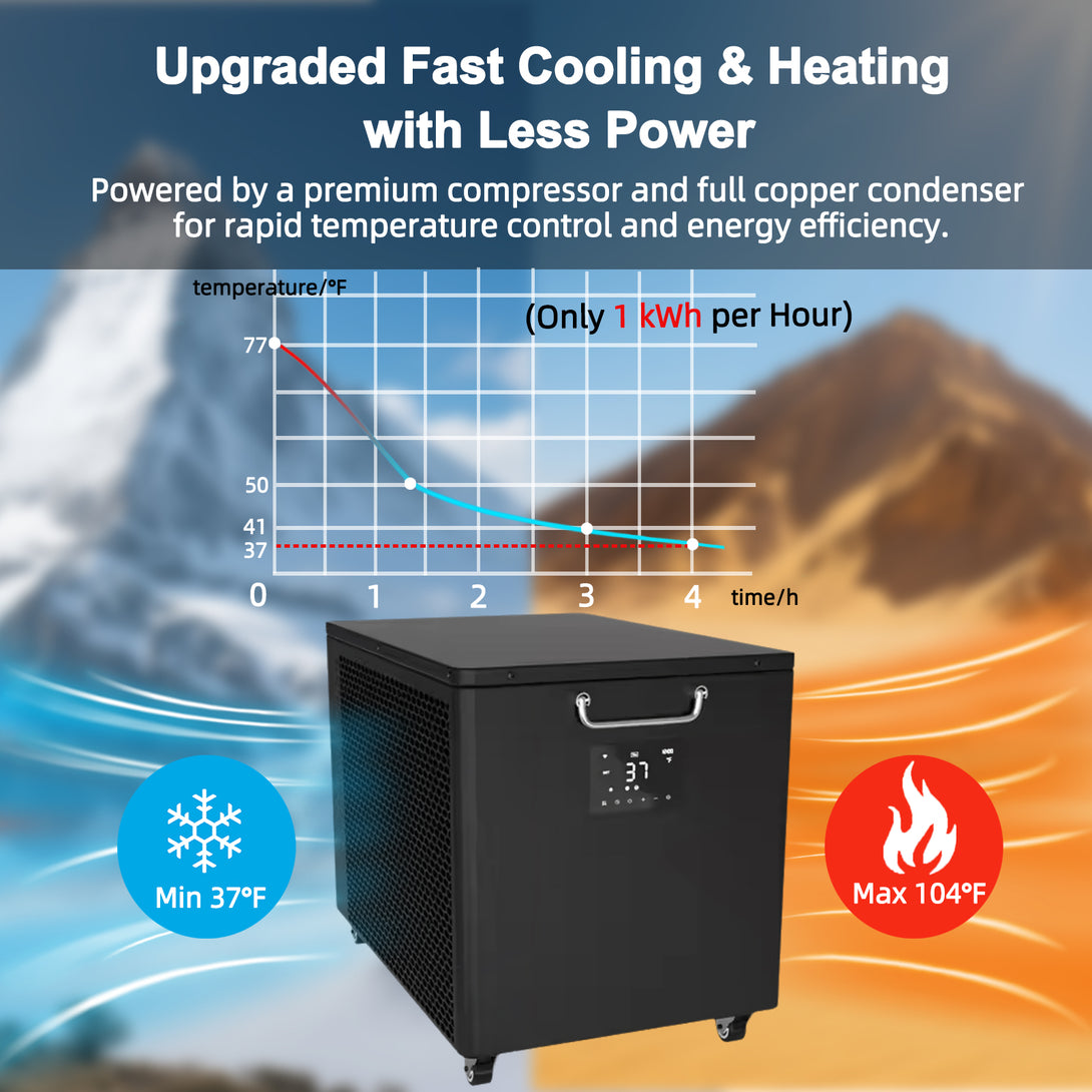 It’s much cheaper and easier to cool your ice bath with a cooler than adding ice. Simply turn on the cooler and select the temperature you want.